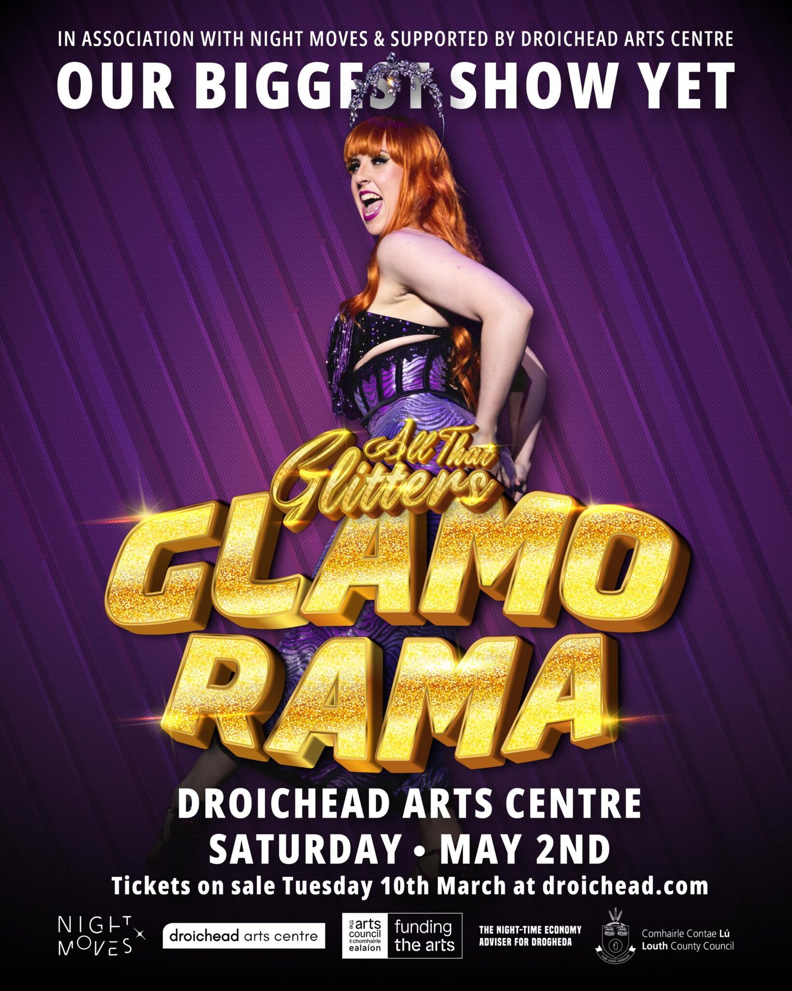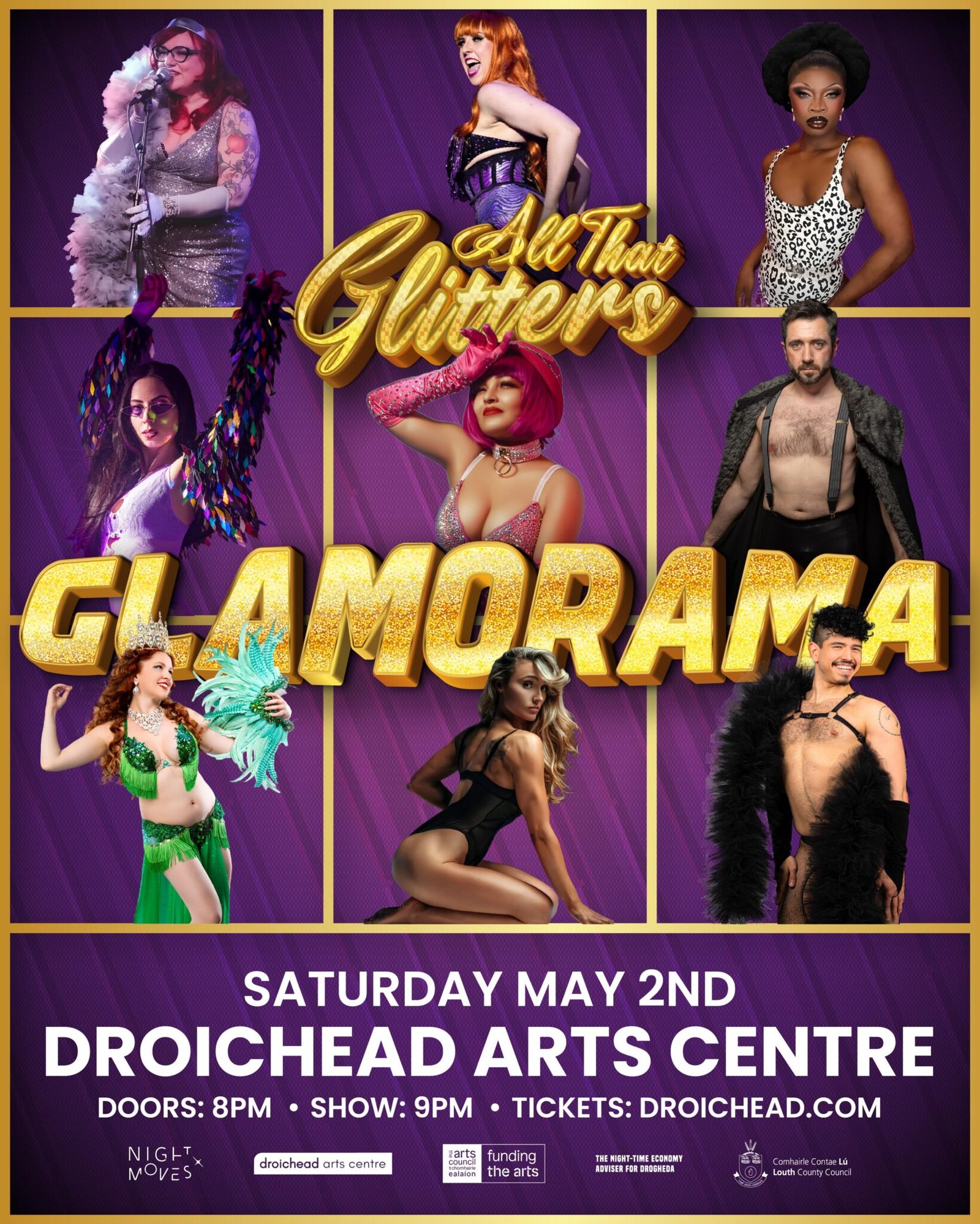 Our biggest show yet, All That Glitters presents GLAMORAMA! in association with Night Moves and with support from Droichead Arts Centre! For one night only, on May 2nd at Droichead Arts Centre, we bring Irelands best and brightest cabaret talent to Drogheda! Pole dancers, burlesque artists, circus performers and MORE!! Plus the UKs number one burlesque performer, Cleopantha, for her first ever show in Ireland! Don’t miss Droghedas Sexiest Night Out, now bigger, badder and bolder then ever!