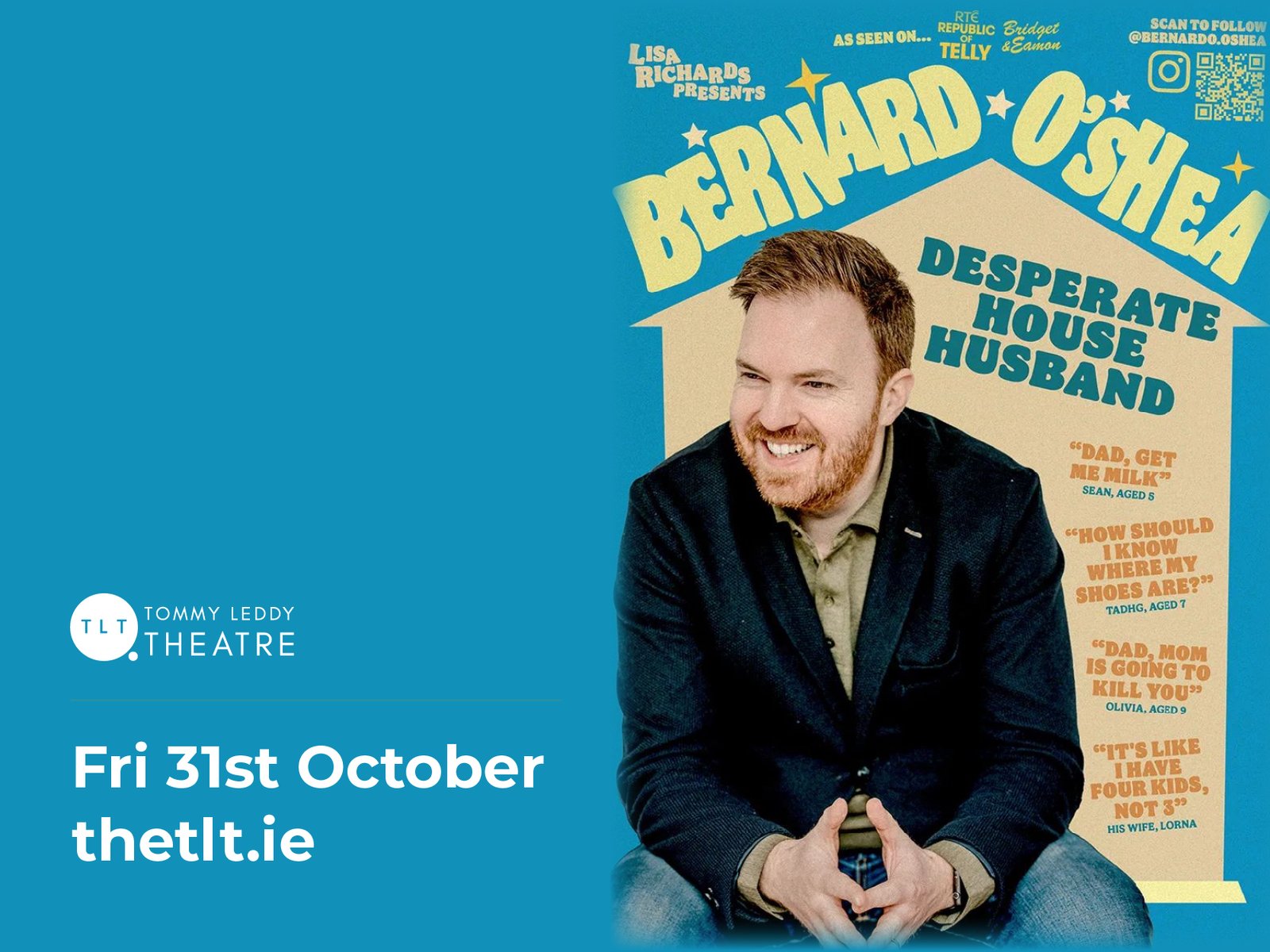 Don’t miss your chance to join Bernard O’Shea for an evening of big laughs, sharp observations, and a cheeky look at family life like you’ve never seen it before.