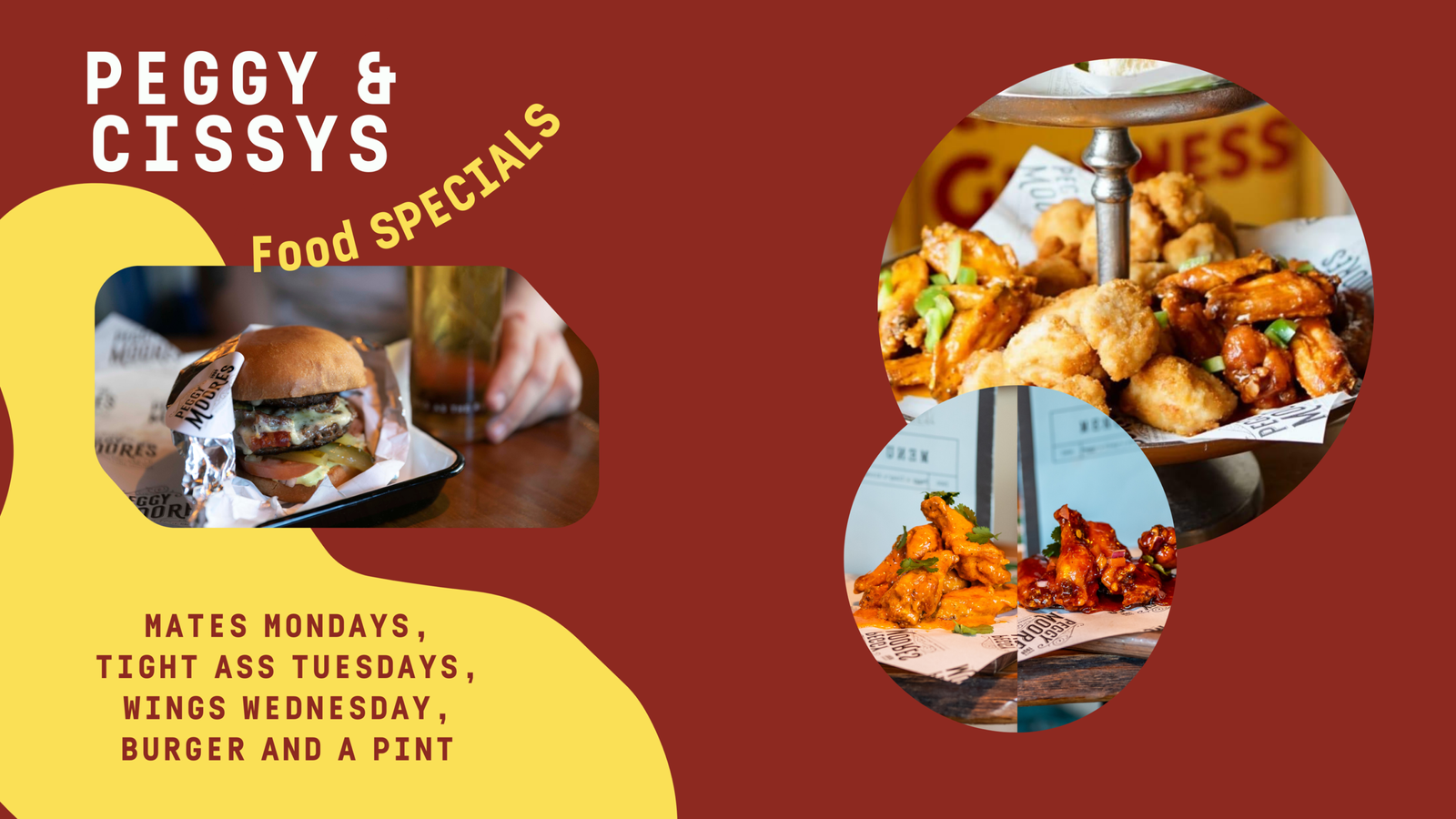 Date Mon 9 February 2026 Food Specials at Peggy’s Mates Mondays Tight Ass Tuesdays Wings Wednesday Burger and a pint Share this event + Add to Google Calendar + iCal / Outlook export 00 days 00 hours 00 minutes 00 seconds Tags: What's On
