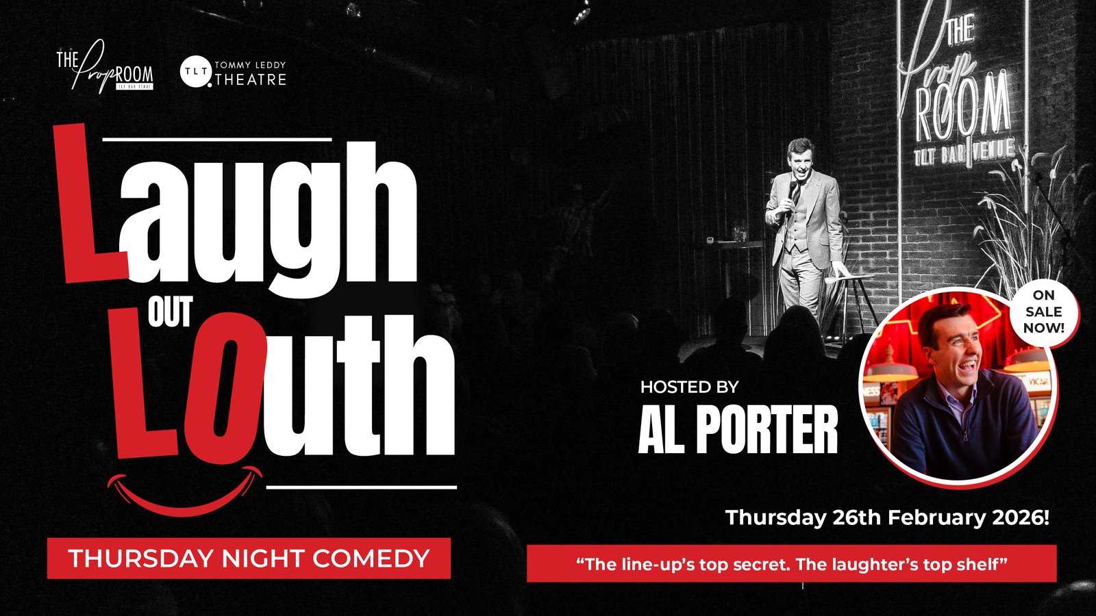 If you love comedy with a bit of risk, excitement and genuine buzz in the room, this is a night you won’t want to miss. This brand-new monthly club at The Prop Room in The TLT is built around one simple promise: no spoilers, no weak line-ups, and no idea who’s walking on stage next. Hosted by Al Porter — one of Ireland’s busiest and sharpest comics — the night delivers the kind of atmosphere that only comes from surprise appearances and performers who want to be there.