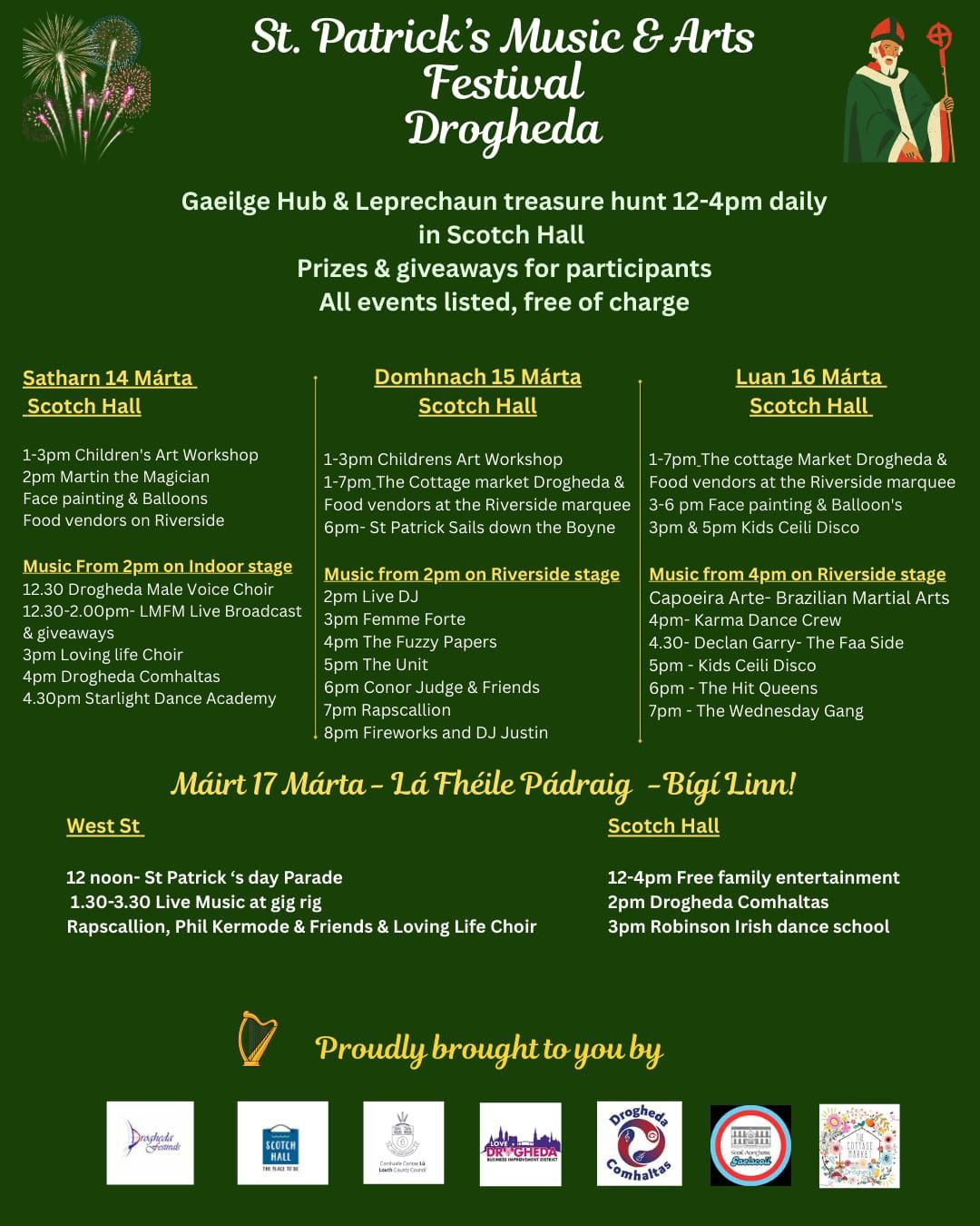 After the parade there will also free family entertainment running from 12 until 4 in Scotch Hall Shopping Centre with live performances by Drogheda Comhaltas and Robinson School of Irish Dancing.